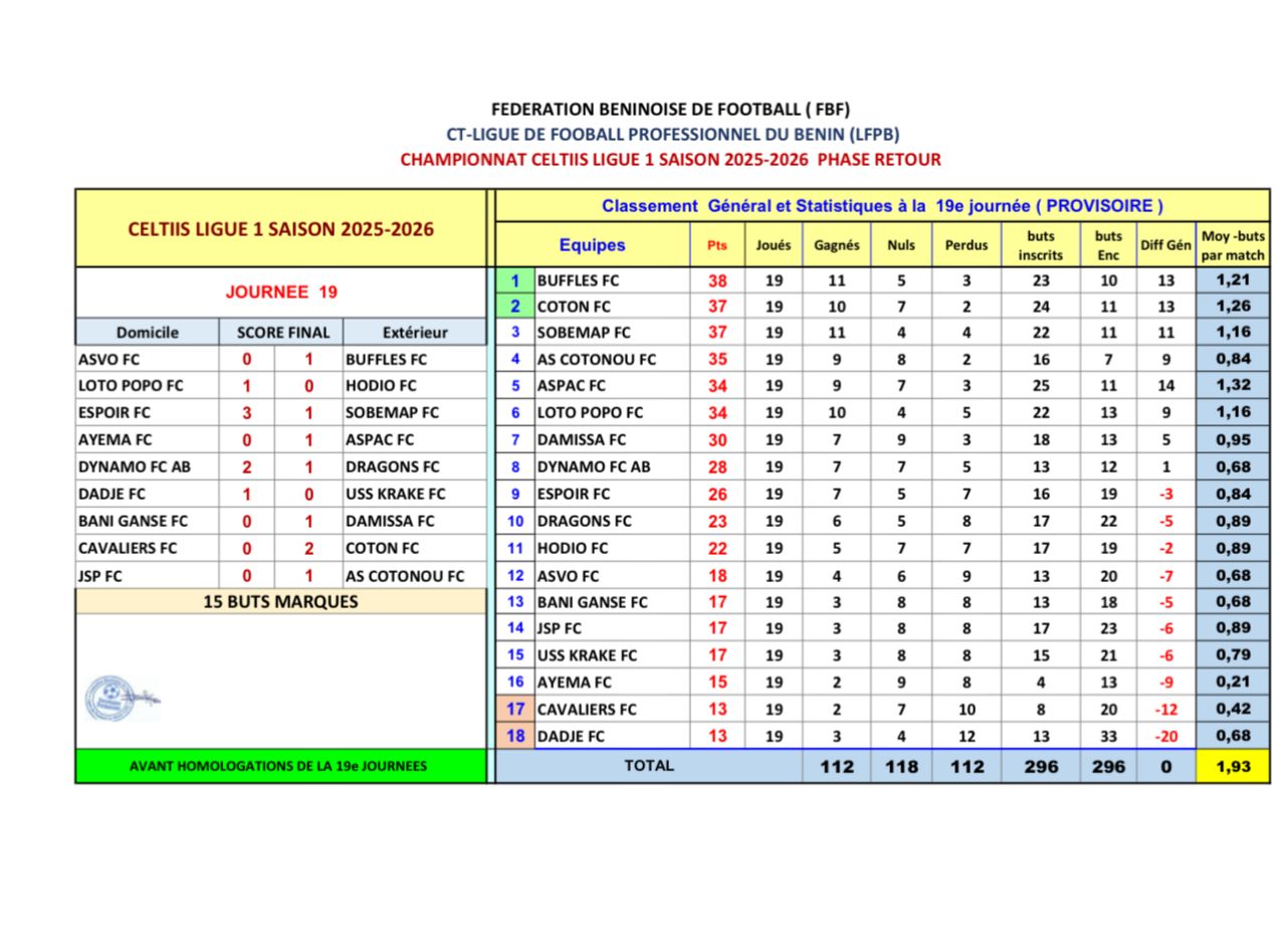 Grâce à cette victoire, les Buffles FC totalisent désormais 38 points et prennent provisoirement la tête du classement, avec une courte avance d’un point sur Coton FC, leur principal poursuivant. La bataille pour le fauteuil de leader s’annonce donc intense au fil des prochaines journées. À Parakou et dans tout le Borgou, les supporters nourrissent déjà l’espoir de voir les Buffles poursuivre sur cette lancée afin de conserver leur position et viser les sommets de la Celtis Ligue Pro cette saison.